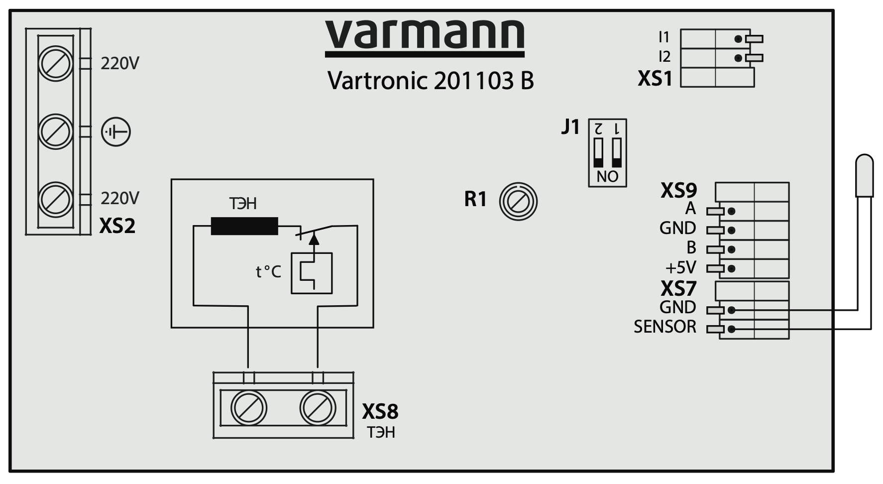 Схема с ручным регулированием позволяет осуществлять регулирование температуры нагретого в теплообменнике воздуха в автоматическом режиме. Температура нагретого воздуха устанавливается переменным резистором R1 на силовой плате управления ТЭН Vartronic 201103В, которую необходимо перевести в режим работы от датчика температуры воздуха и установить положение микропереключателей J1.1-ON, J1.2-ON.