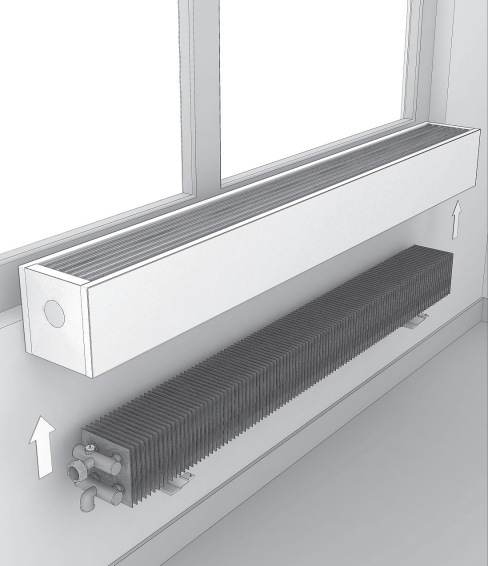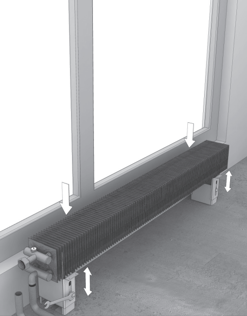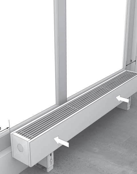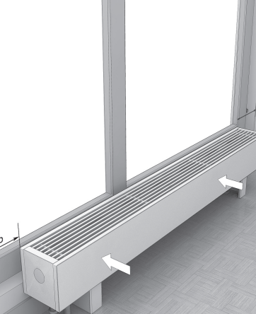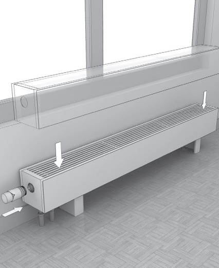 Распакуйте конвектор. Разместите конвектор по центру окна в соответствии с требованиями проекта системы отопления, дизайн-проекта помещения, заказного чертежа.