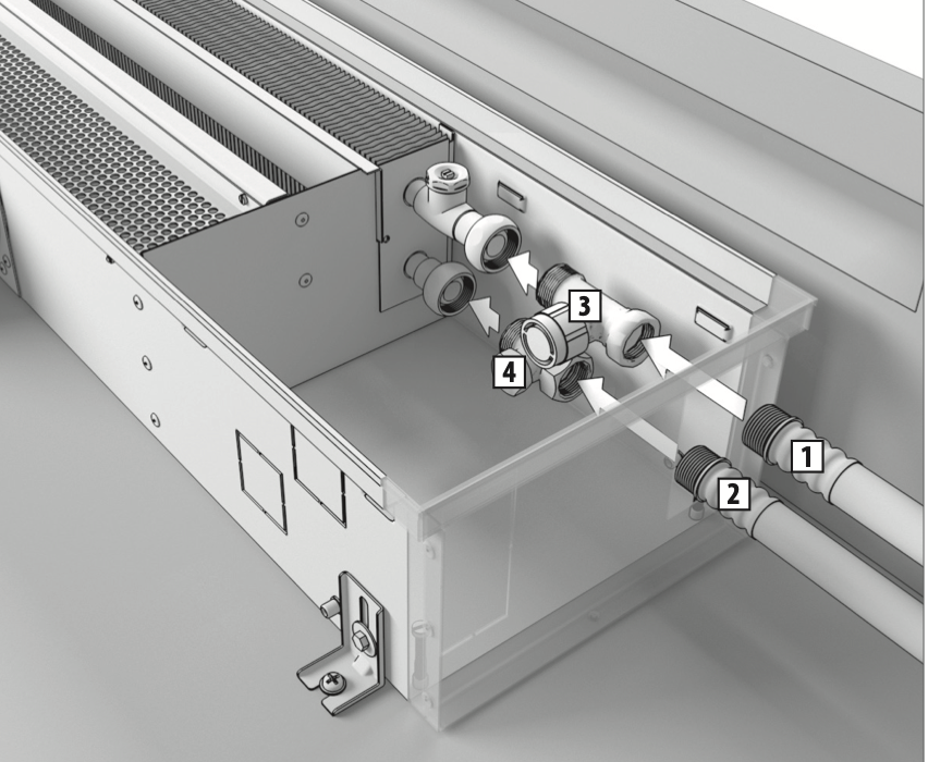 Если конвекторы имеют соединения друг с другом в заказном исполнении, воспользуйтесь дополнительной инструкцией по монтажу конвекторов в заказном исполнении.