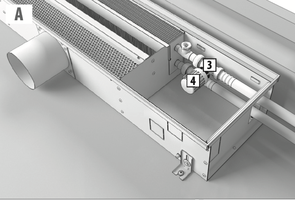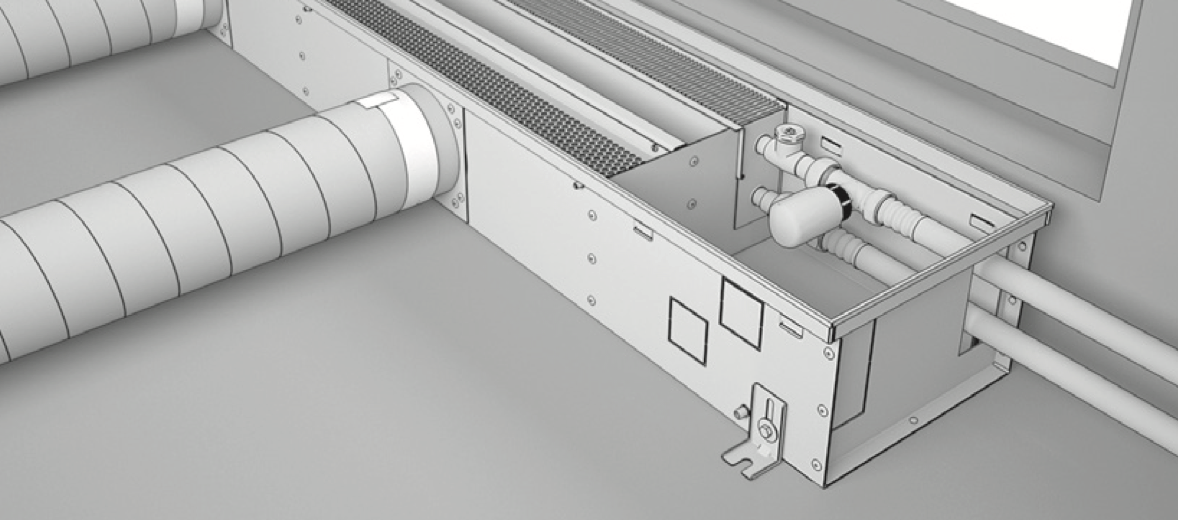 Подведите воздуховоды приточной вентиляции согласно проекту ВК и подключите к вводным патрубкам конвектора. Зафиксируйте воздуховоды монтажными хомутами или вентиляционным скотчем. При необходимости, теплоизолируйте воздуховоды.