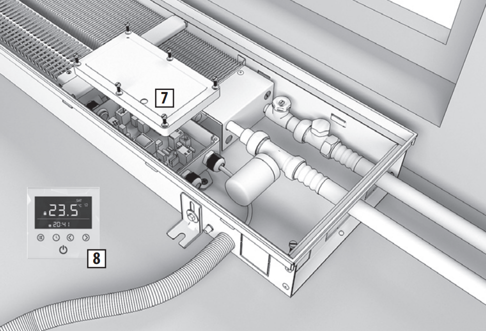 Корпус конвектор для эксплуатации во влажных помещениях оснащается дренажными отводами и по умолчанию изготавливается для подключения к электрической сети с напряжением питания -24 В от внешнего блока питания (приобретается отдельно). Следует избегать эксплуатации конвектора в системах отопления с излишним