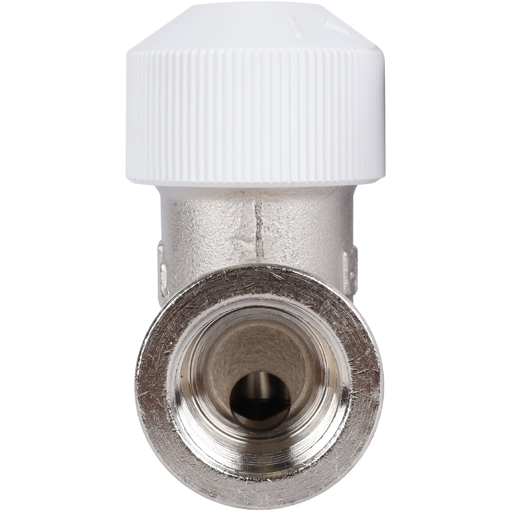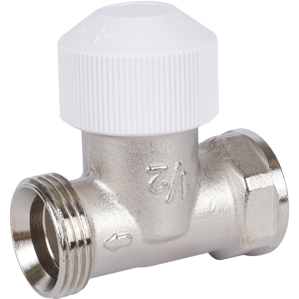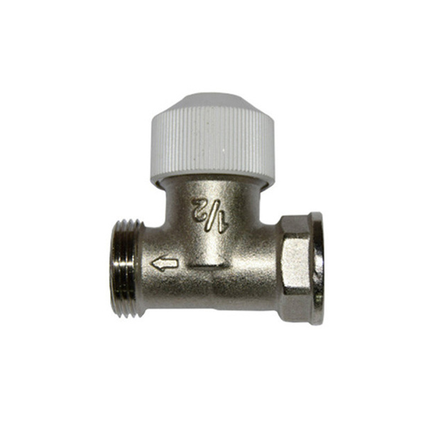 Вентиль на подающую линию DN15, G 3/4”, с предварительной настройкой расхода теплоносителя через конвектор, с защитным колпачком, в латунном корпусе, с нержавеющим стальным шпинделем и двойным концевым уплотнением.