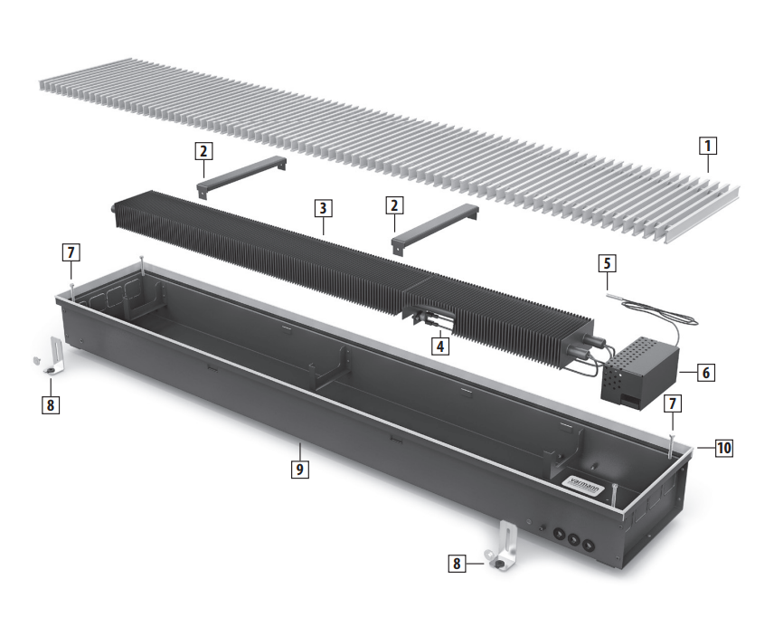 Не допускайте, чтобы корпус конвектора испытывал нагрузки со стороны пола. При использовании расширяющихся напольных покрытий, например паркета, а также системы “теплый пол”, необходимо устанавливать в месте стыка рамки конвектора с покрытием компенсационные швы 2, например пробковую, либо резиновую полосу. При влажной уборке не допускайте попадания воды на элементы, подключенные к электрической сети. При очистке решетки и корпуса конвектора не используйте абразивных материалов, растворителей, кислотных и щелоче-содержащих моющих средств. |