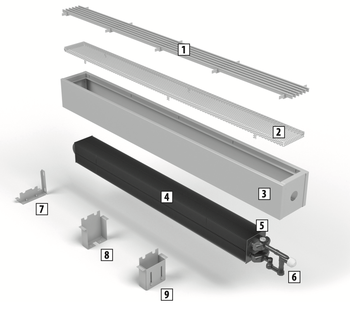 Установите корпус конвектора и зафиксируйте его винтами на установленных регулируемых напольных консолях. Установите привод на термостатический вентиль в соответствии с выбранной схемой регулирования. Термостатическая схема регулирования: – термостатическая головка (тип 702721-цвет по RAL); – термостат с дистанционным управлением (тип 702311). Схема регулирования с настенным регулятором: – термоэлектрический сервопривод (тип 702361); – настенный регулятор (тип 703101/703102).