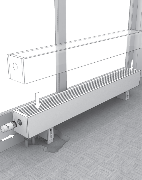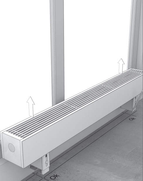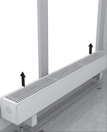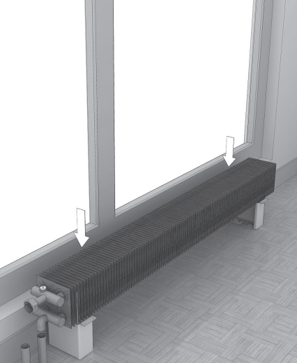 Распакуйте конвектор. Разместите конвектор по центру окна в соответствии с требованиями проекта системы отопления, дизайн-проекта помещения, заказного чертежа.