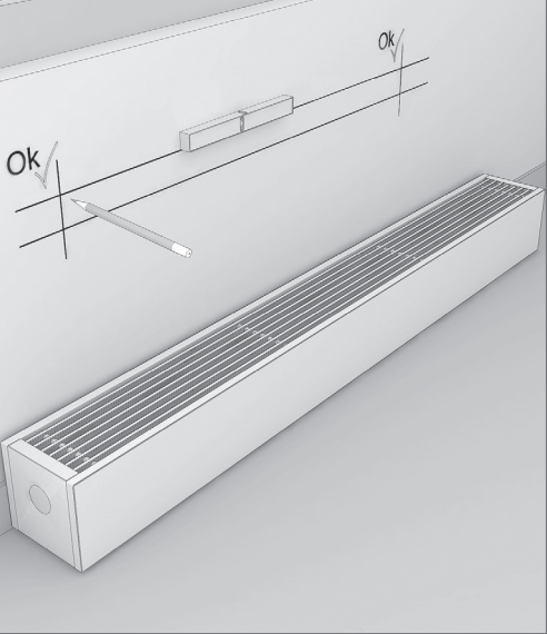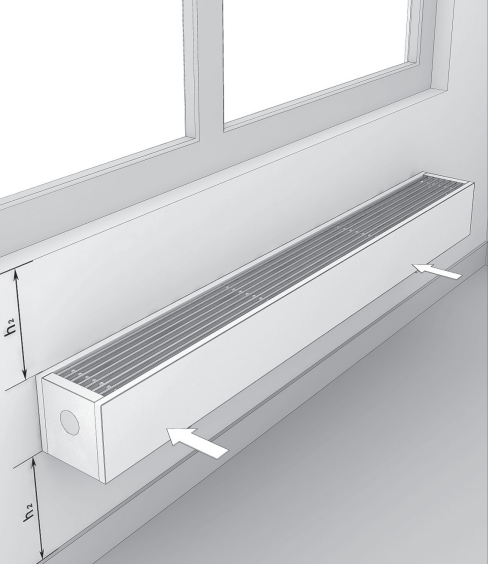 Распакуйте конвектор. Разместите конвектор по центру окна в соответствии с требованиями проекта системы отопления, дизайн-проекта помещения, заказному чертежу, выдерживая минимальные расстояния h1 и h2 (в зависимости от типоразмера конвектора), указанные на стр. 1 настоящего руководства. Отметьте расположение конвектора на стене.