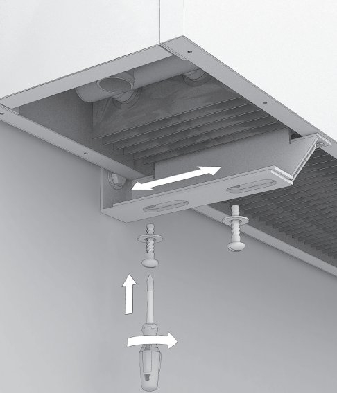 Разместите конвектор, учитывая монтажные отверстия под настенные консоли. Просверлите в стене отверстия Ø8 мм под дюбели. Установите консоли и затяните их винтами Ø5 мм.