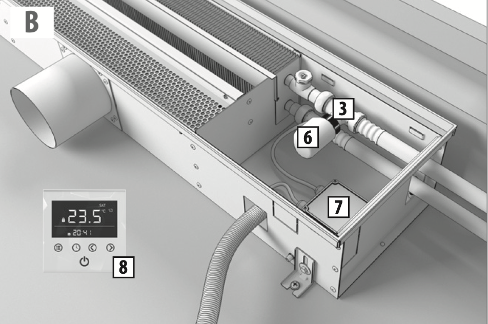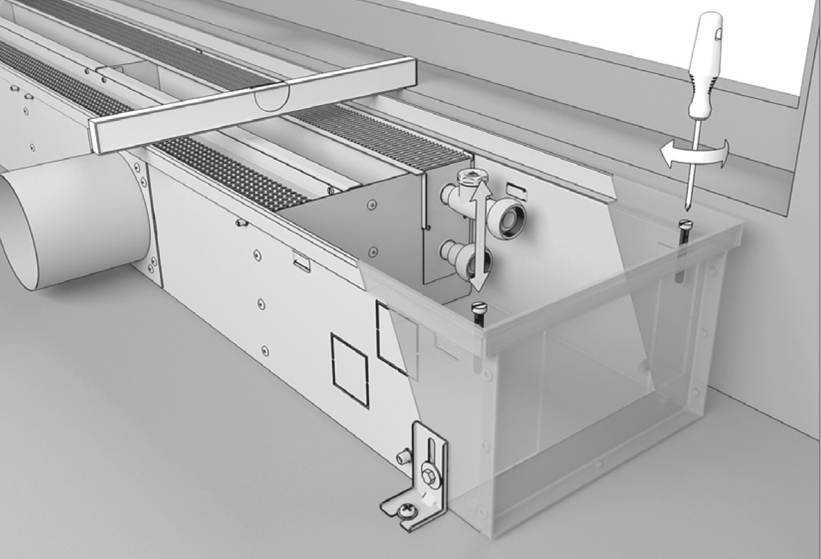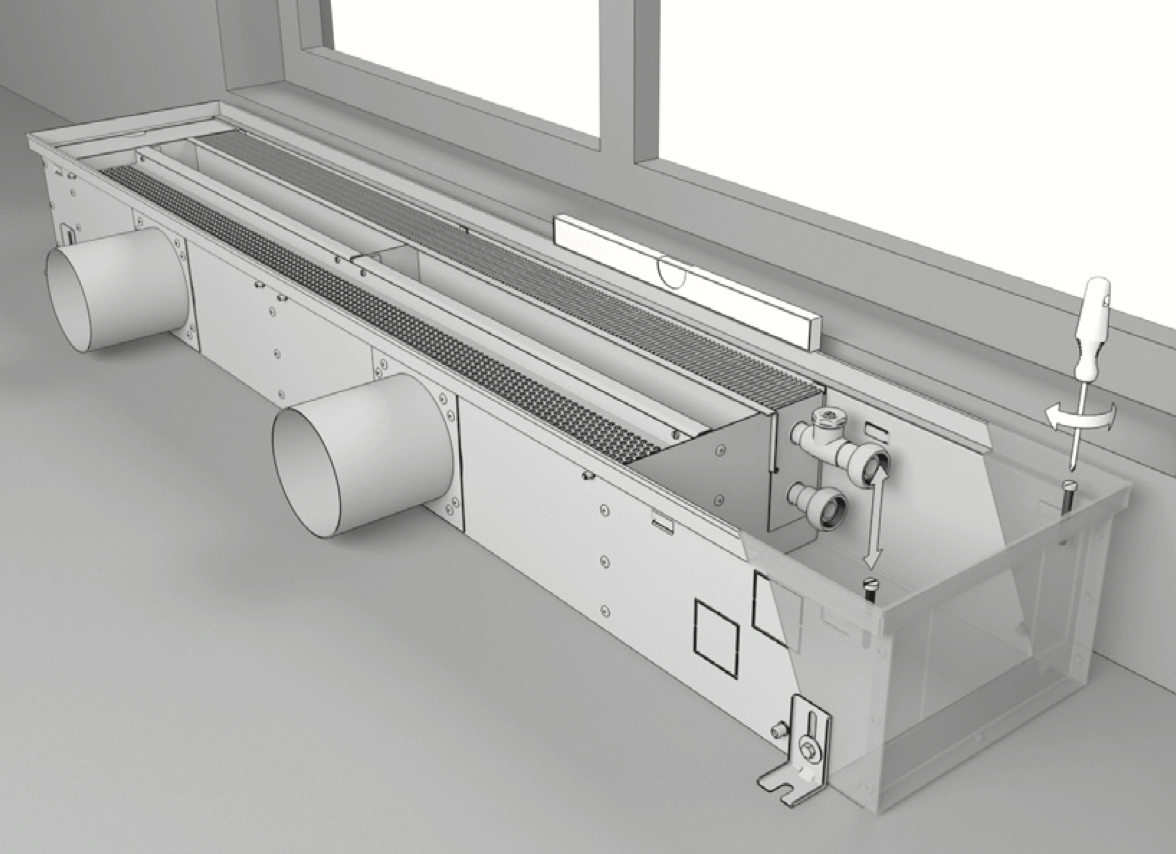 Подведите воздуховоды приточной вентиляции согласно проекту ВК и подключите к вводным патрубкам конвектора. Зафиксируйте воздуховоды монтажными хомутами или вентиляционным скотчем. При необходимости, теплоизолируйте воздуховоды.