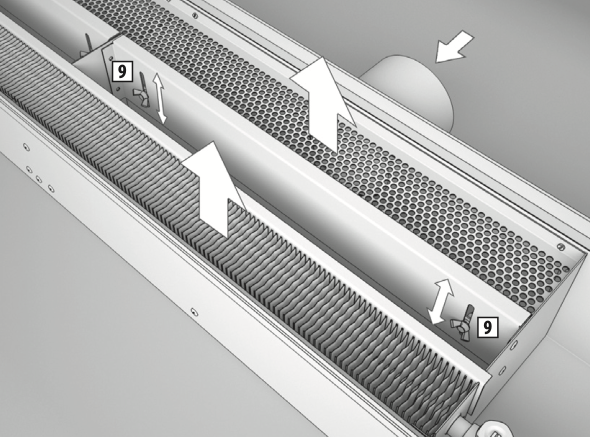 В конвекторе реализована возможность регулирования распределения приточного воздуха в зону теплообменника и в пленумную коробку. Регулирование осуществляется поднятием / опусканием шиберной заслонки 9. При опущенной шиберной заслонке поток приточного воздуха выходит через перфорацию пленумной коробки. При поднятой заслонке поток приточного воздуха проходит через теплообменник конвектора.