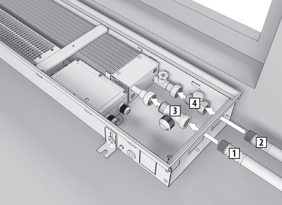 Если конвекторы имеют соединения друг с другом в заказном исполнении, воспользуйтесь дополнительной инструкцией по монтажу конвекторов в заказном исполнении. Всю недостающую информацию можно получить в технических каталогах компании Varmann