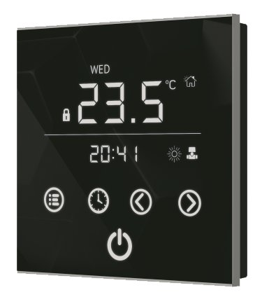 Настенный регулятор имеет великолепный дизайн с единой лицевой стороной полностью выполненной из закаленного стекла.