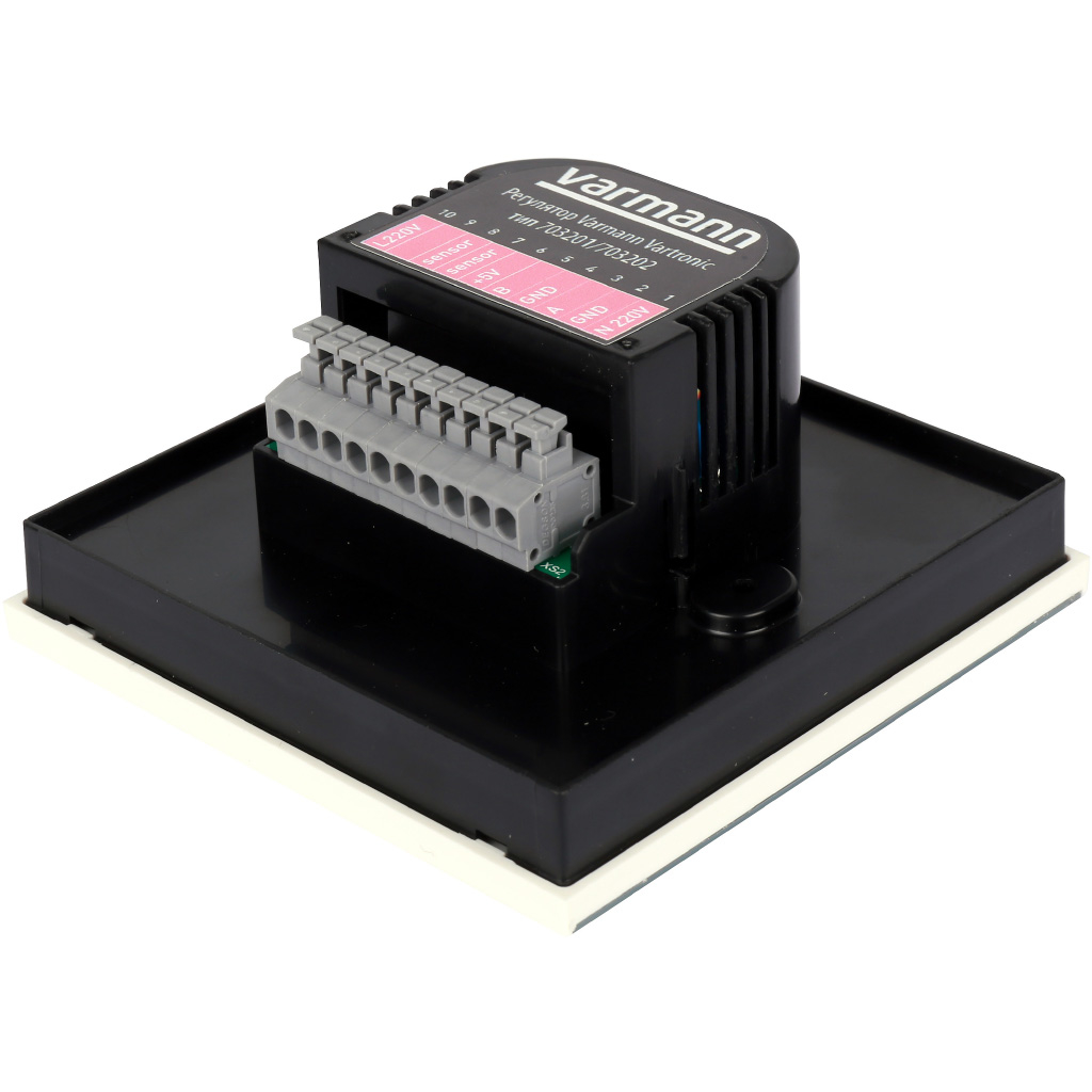 Настенный программируемый регулятор Varmann Vartronic для конвекторов с принудительной конвекцией, тип 703201 (черный), 703202 (белый). Визитной карточкой компании Varmann стал новый настенный регулятор собственного производства. Настенный регулятор Vartronic изготавливается в двух цветовых решениях - белого и черного цвета. Регулятор оснащен большим LCD-дисплеем с сенсорным управлением и обеспечивает максимальный комфорт при эксплуатации. Удобный интерфейс позволяет разобраться с возможностями управления даже неопытному пользователю.