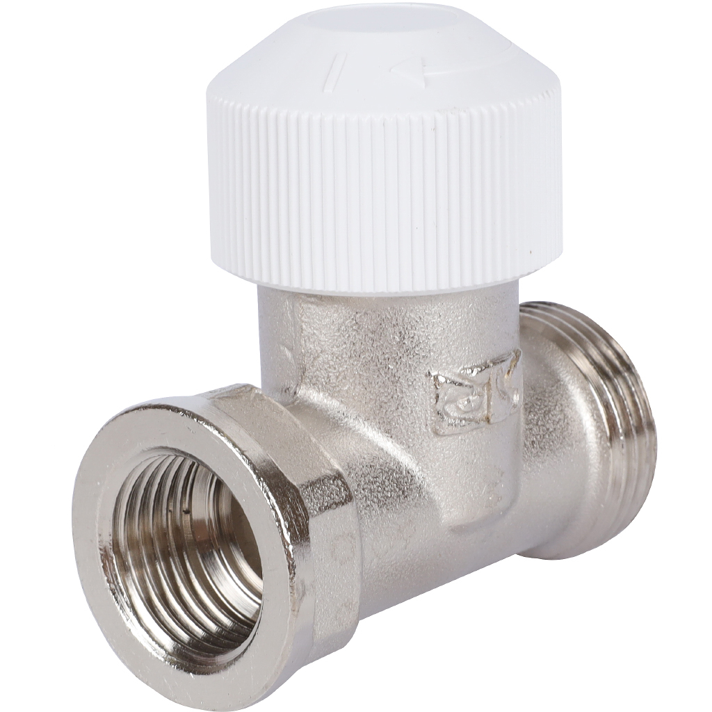 Вентиль на подающую линию DN15, G 3/4”, с предварительной настройкой расхода теплоносителя через конвектор, с защитным колпачком, в латунном корпусе, с нержавеющим стальным шпинделем и двойным концевым уплотнением.